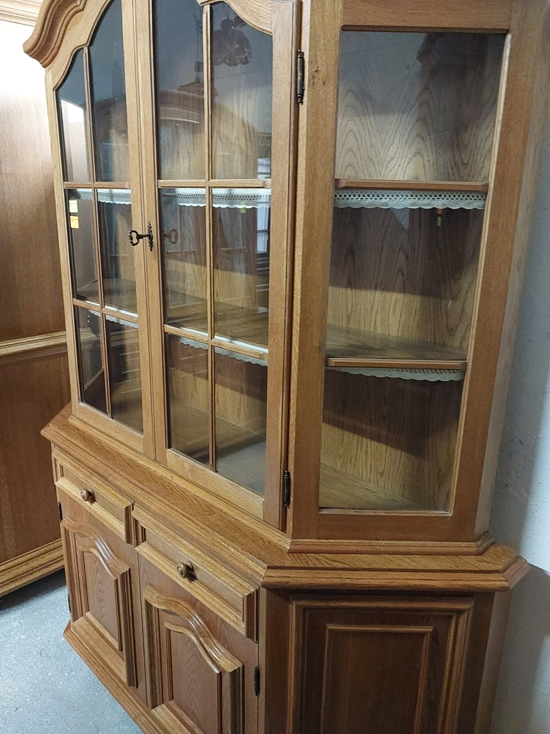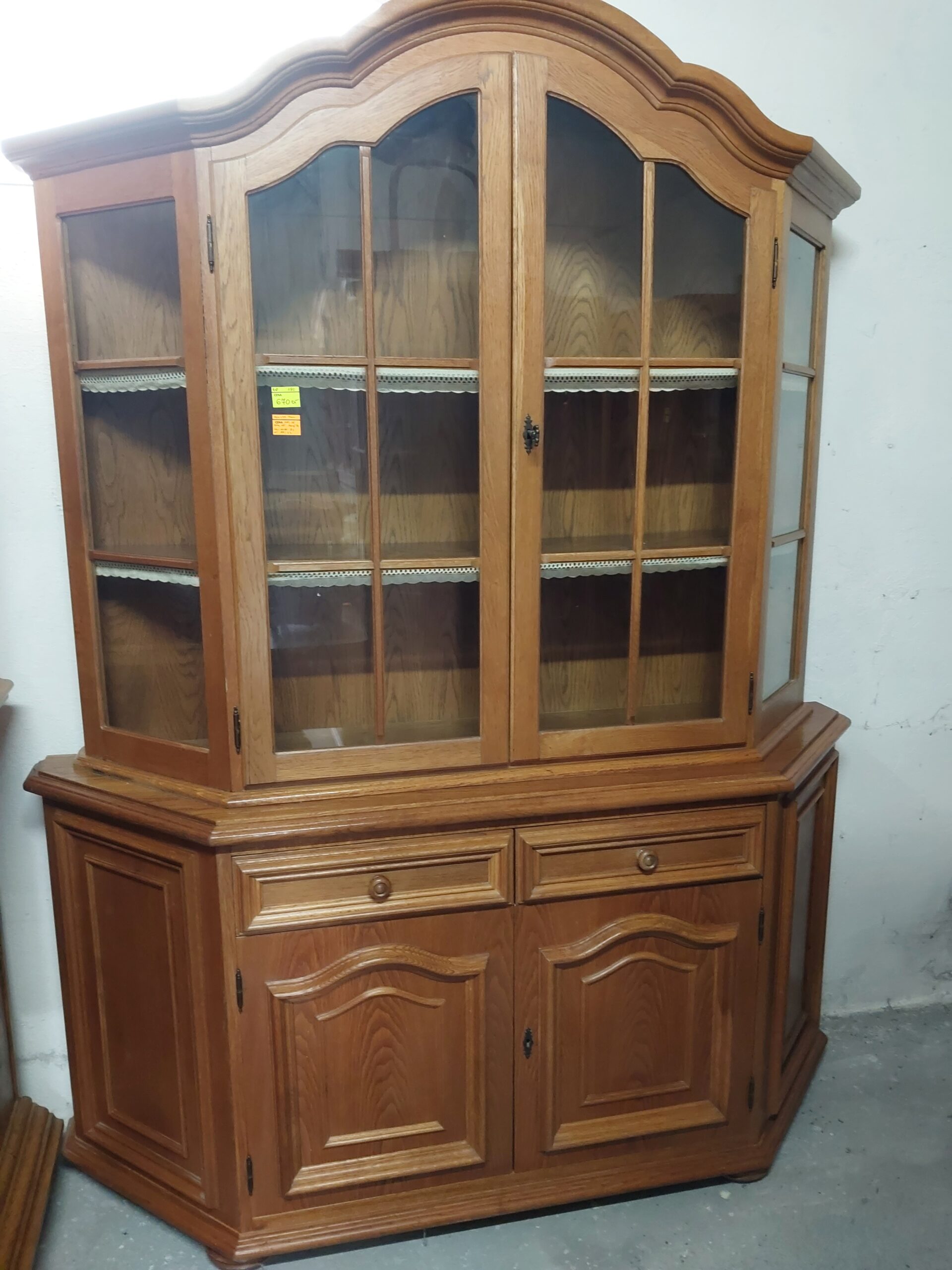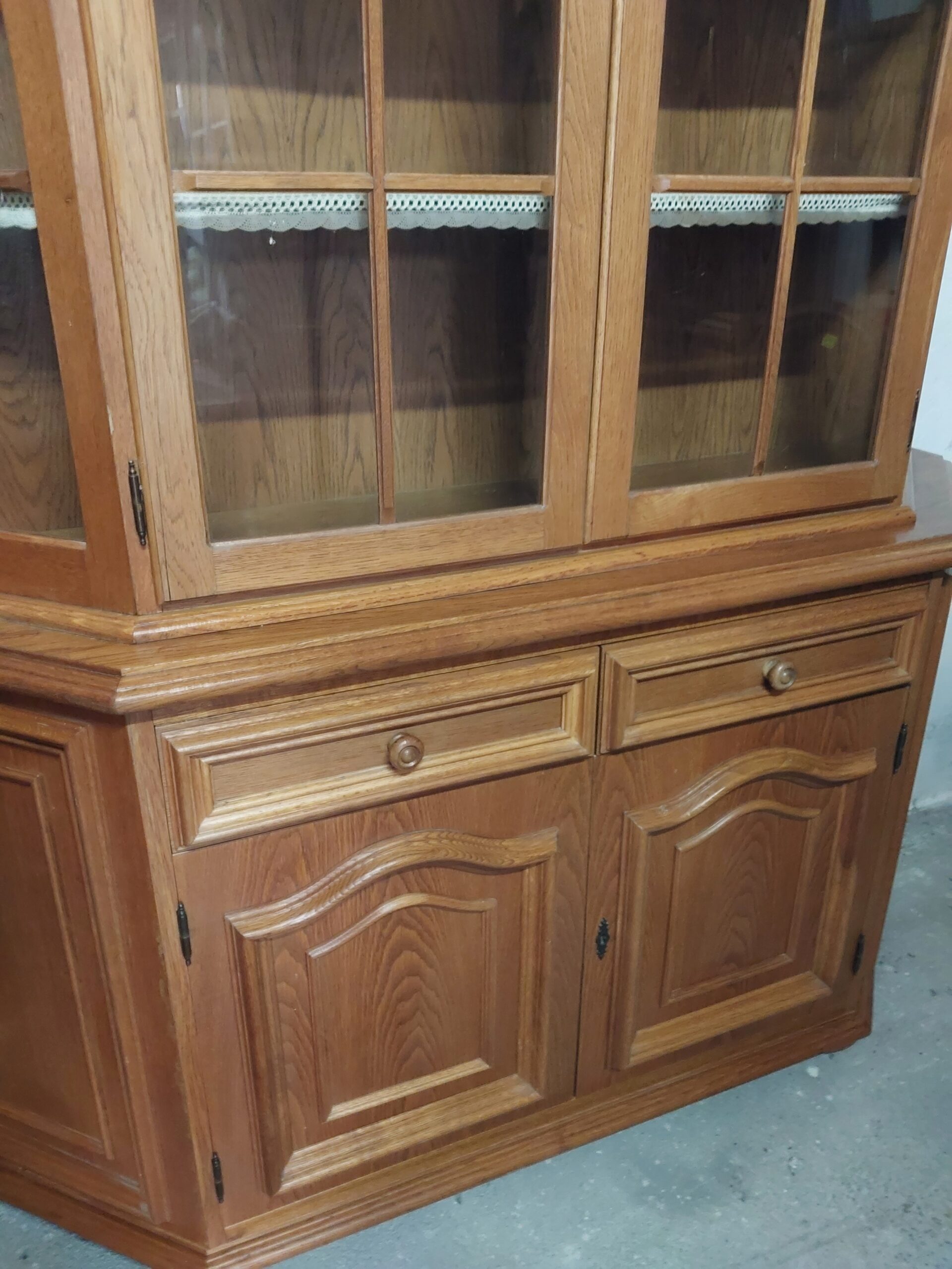 Mamy do zaoferowania stylowy kredens . Mebel składa się z dwóch części. Dół to pojemna komoda osadzona na zdobionej podstawie. Góra to przeszklona nadstawka wykończona ozdobnymi listwami i szprosami. Wymiary: wysokość – 200cm , górny gzyms 35/148 cm , część oszklona 34/140 cm , wysokość do blatu 81 cm , komoda 42/158 cm Stan wizualny kredensu zgodny ze zdjęciami , proponuję odbiór osobisty , oczywiście na życzenie wysyłka zaufanym kurierem prywatnym , transport