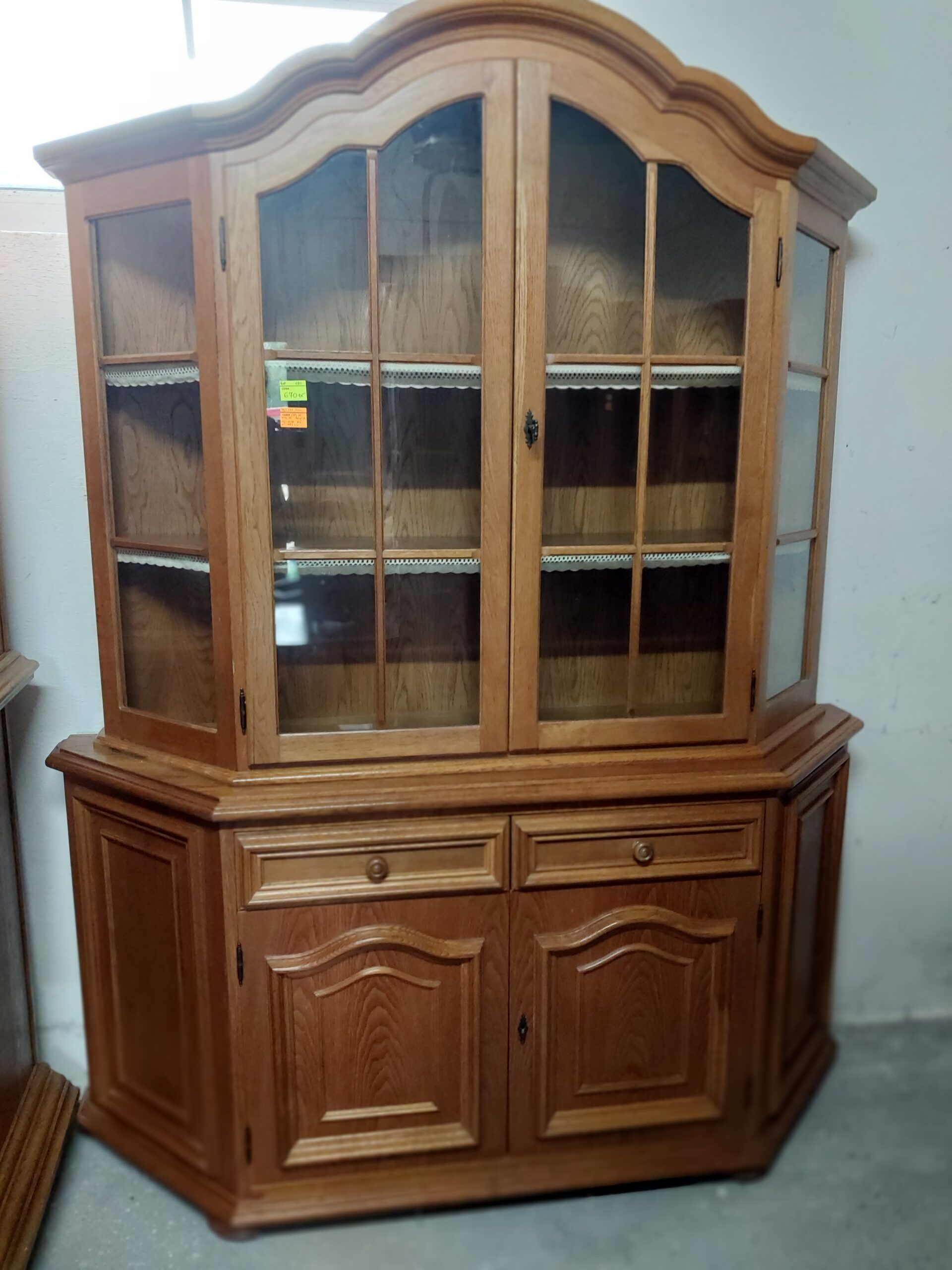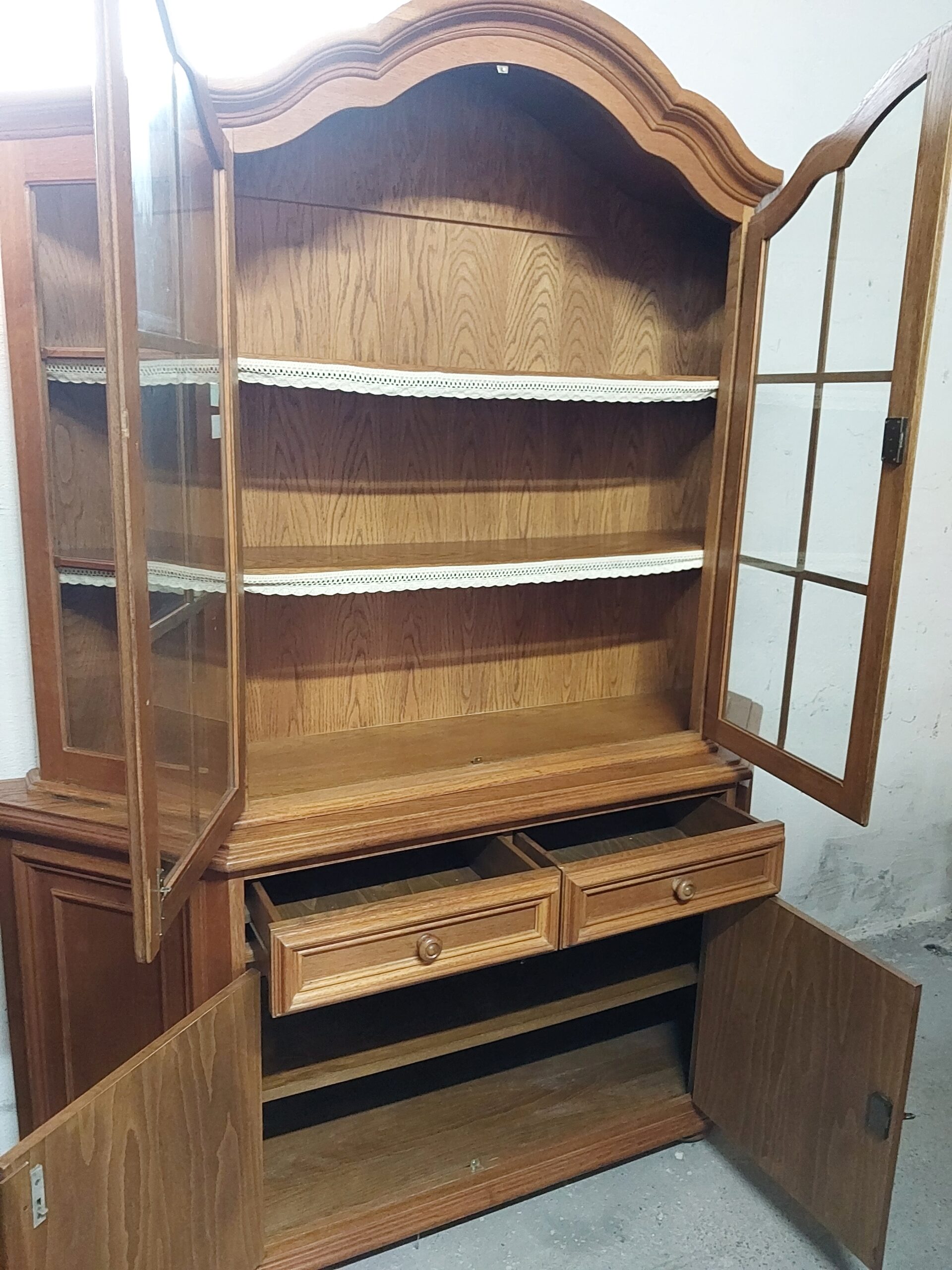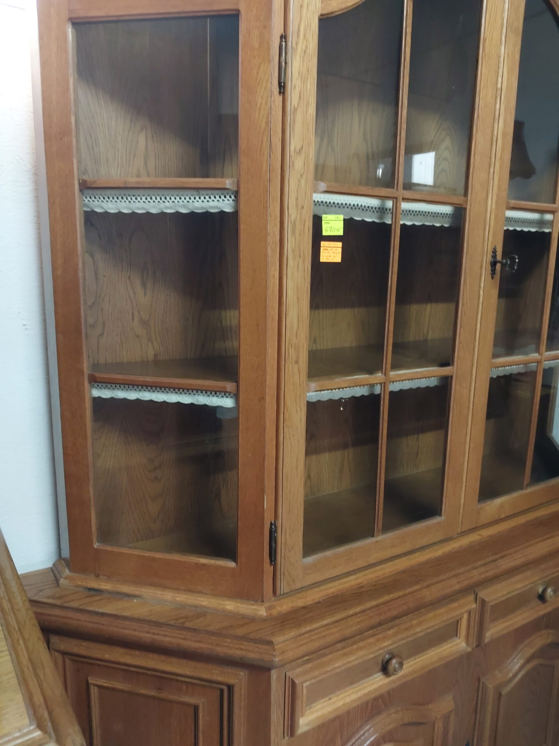 Mamy do zaoferowania stylowy kredens . Mebel składa się z dwóch części. Dół to pojemna komoda osadzona na zdobionej podstawie. Góra to przeszklona nadstawka wykończona ozdobnymi listwami i szprosami. Wymiary: wysokość – 200cm , górny gzyms 35/148 cm , część oszklona 34/140 cm , wysokość do blatu 81 cm , komoda 42/158 cm Stan wizualny kredensu zgodny ze zdjęciami , proponuję odbiór osobisty , oczywiście na życzenie wysyłka zaufanym kurierem prywatnym , transport