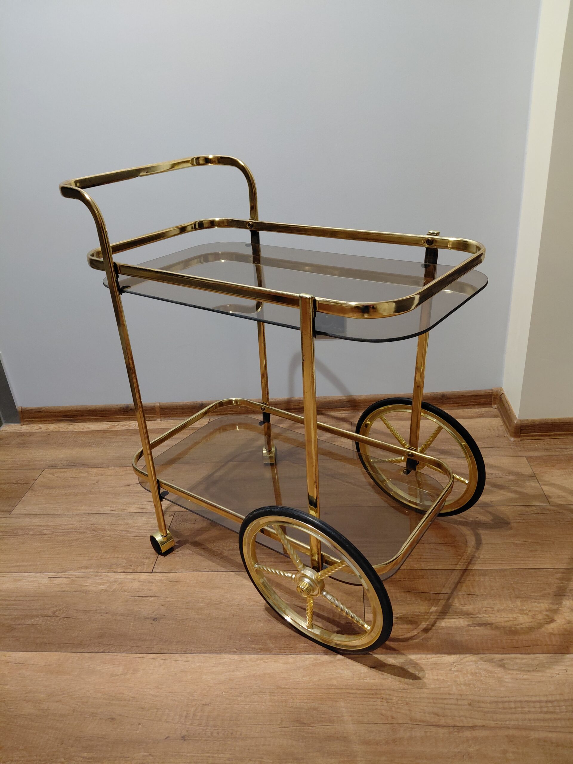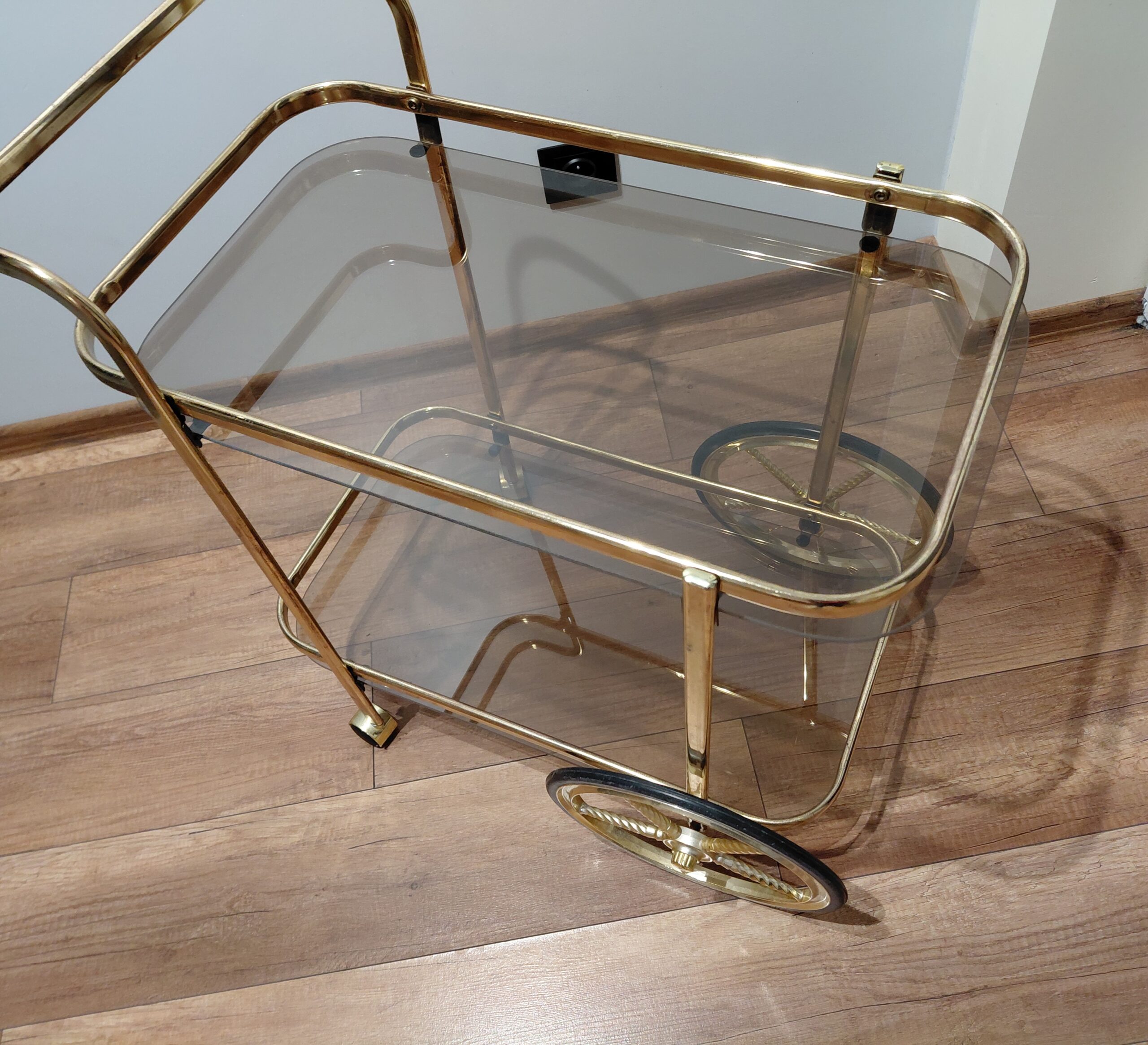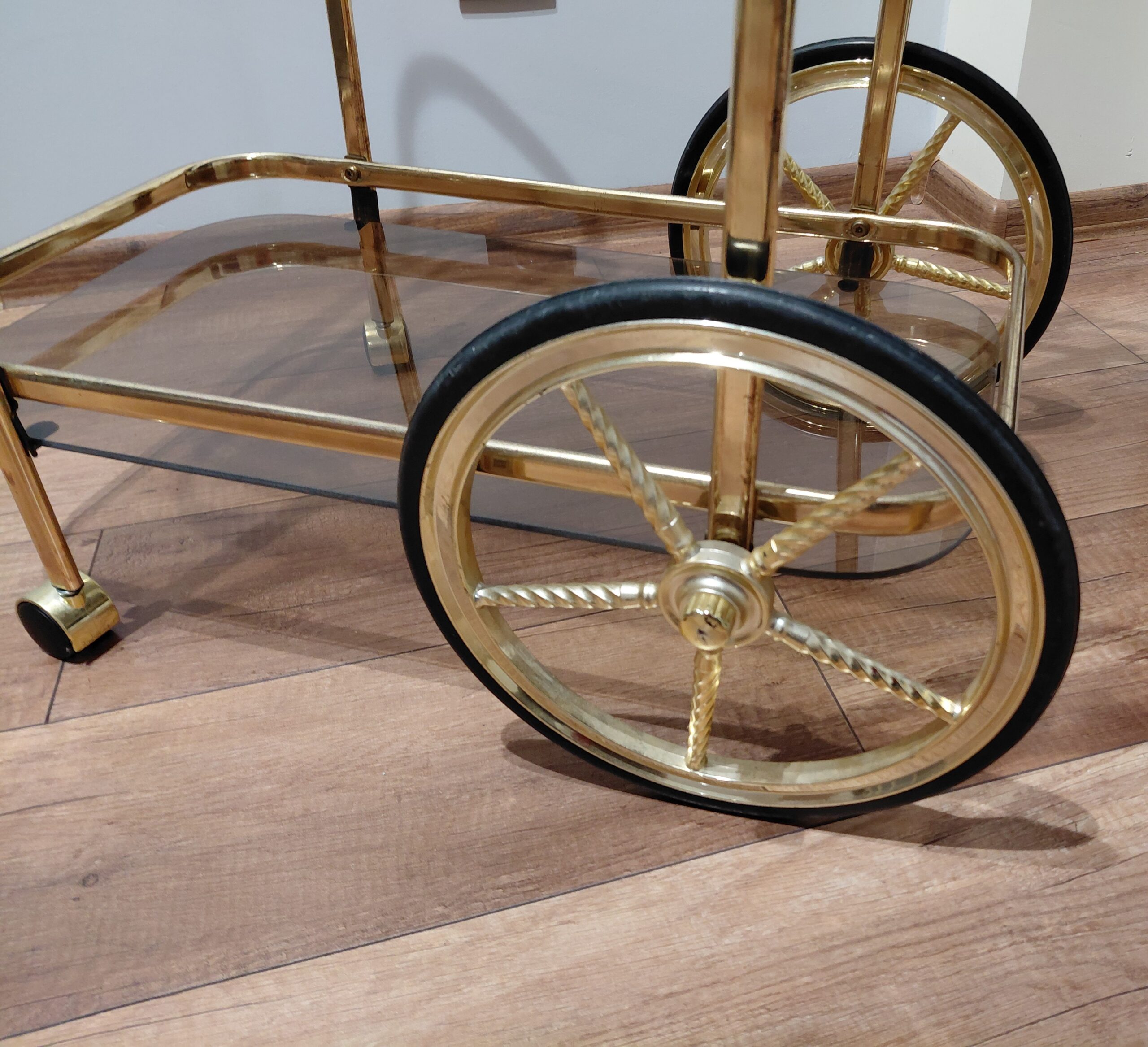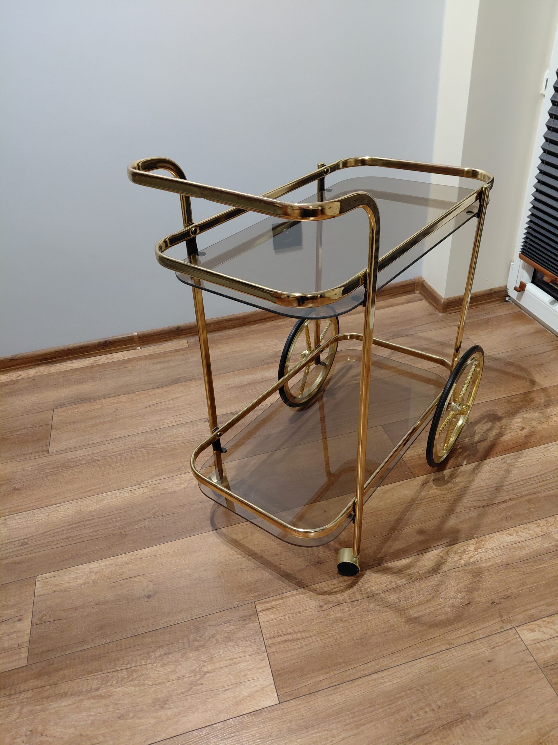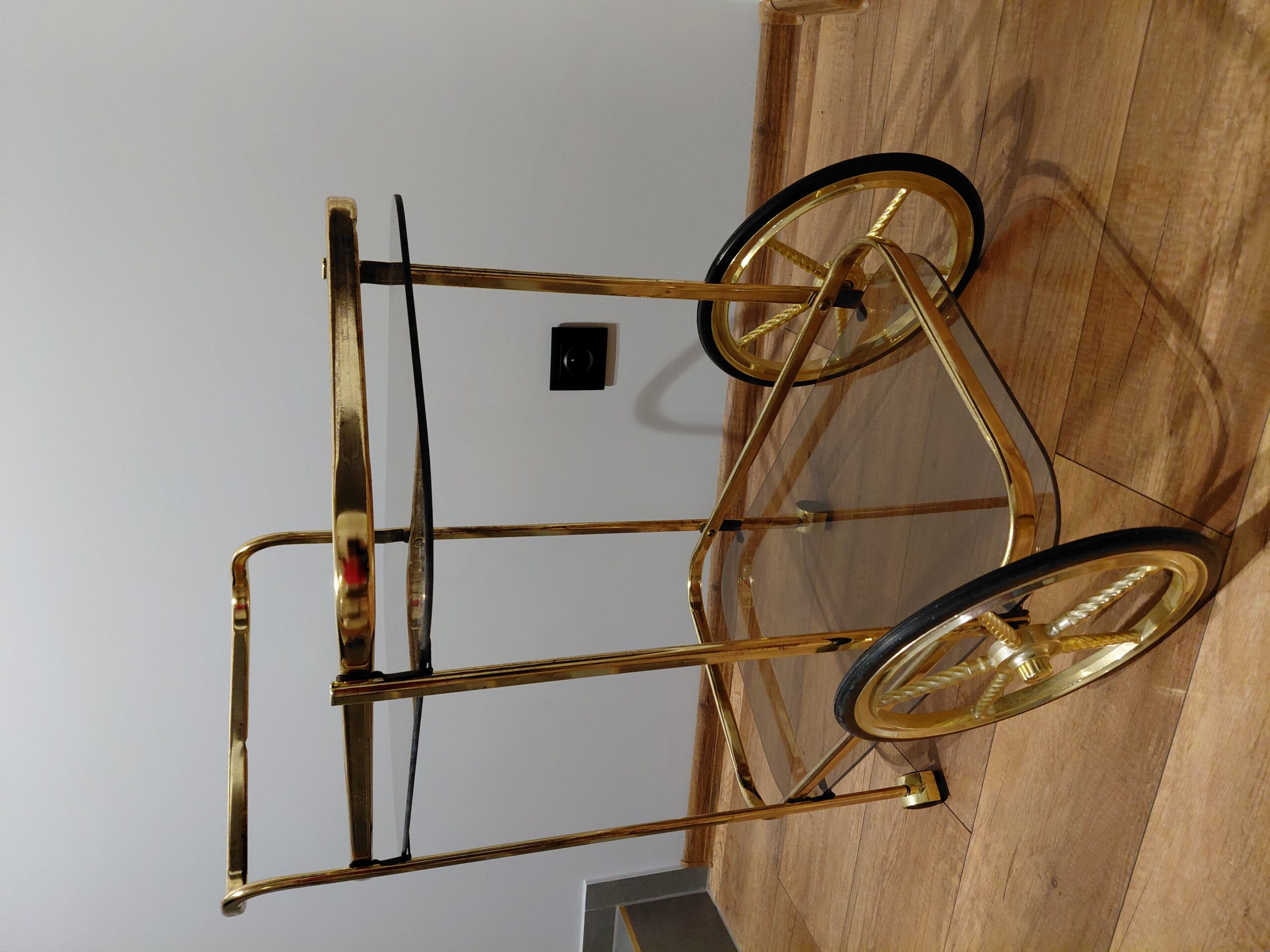 Sprzedam mobilny stylizowany barek na kółkach w złotej lekkiej aluminiowej konstrukcji.