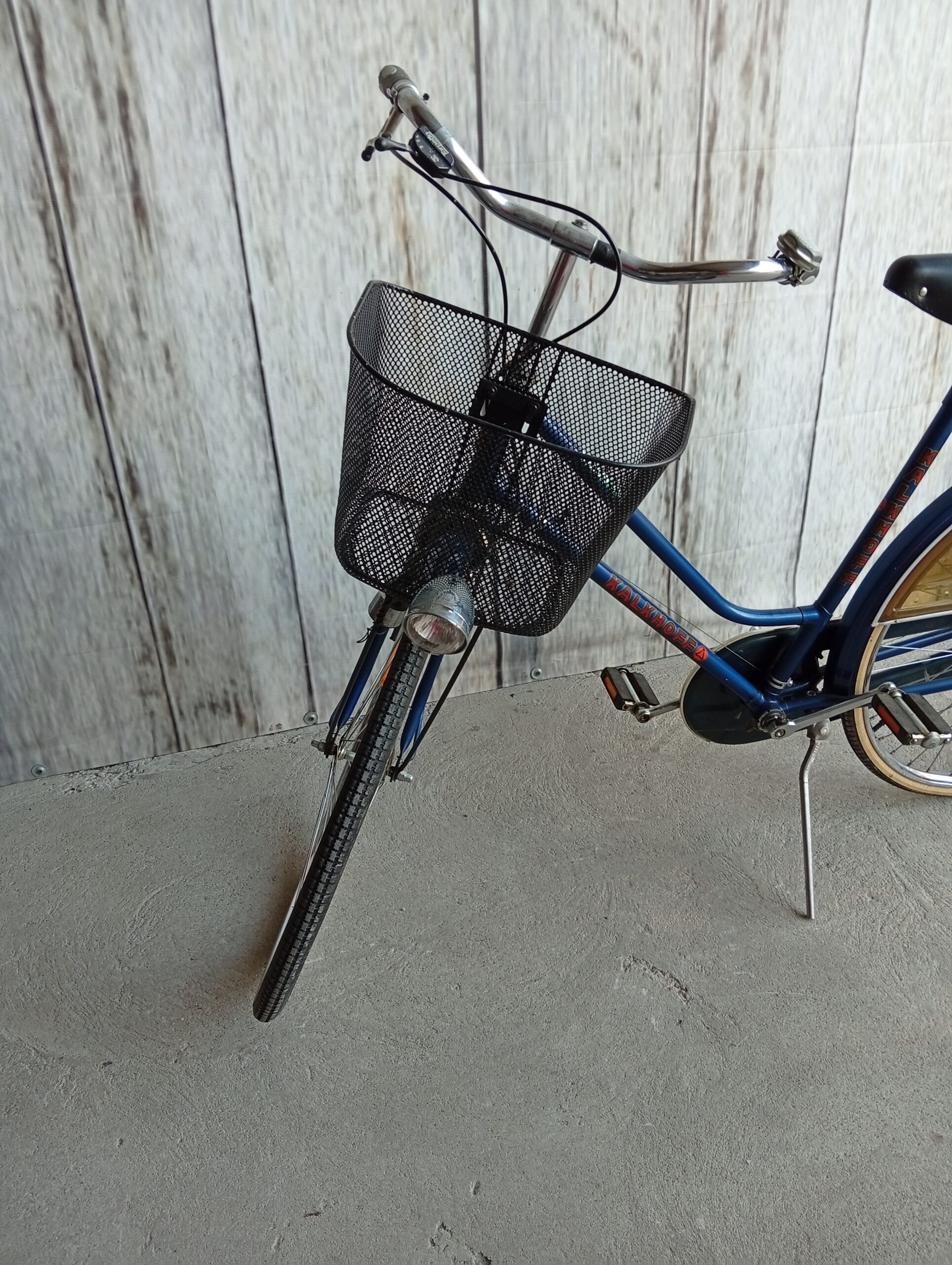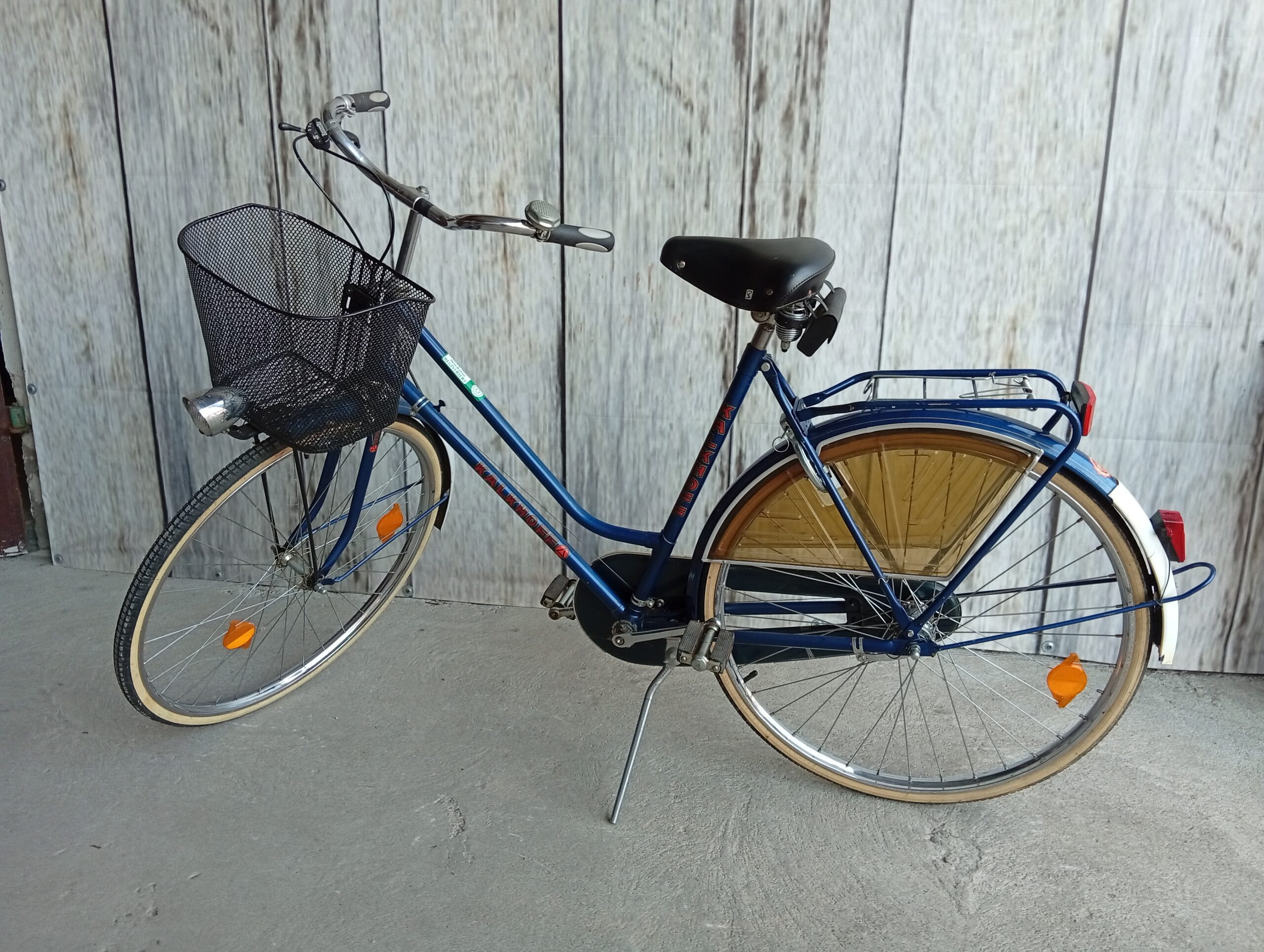 Rower posiada przedni koszyk na zakupy, tylny bagażnik, osłony na koła (spódnice) oraz oświetlenie.