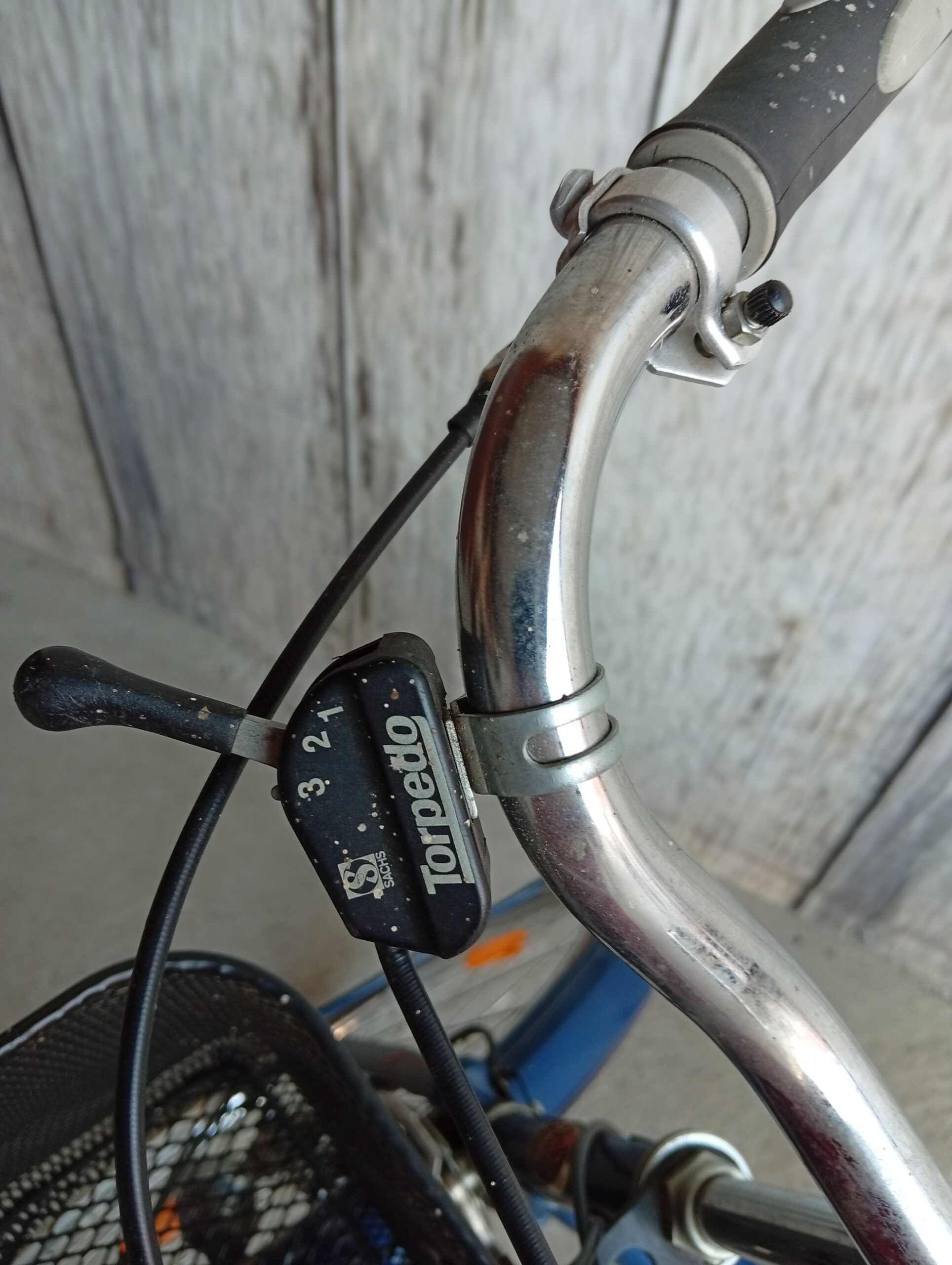 Sprzedam używany rower miejski charakteryzujący się damską ramą typu „łabędź” w kolorze niebieskim.