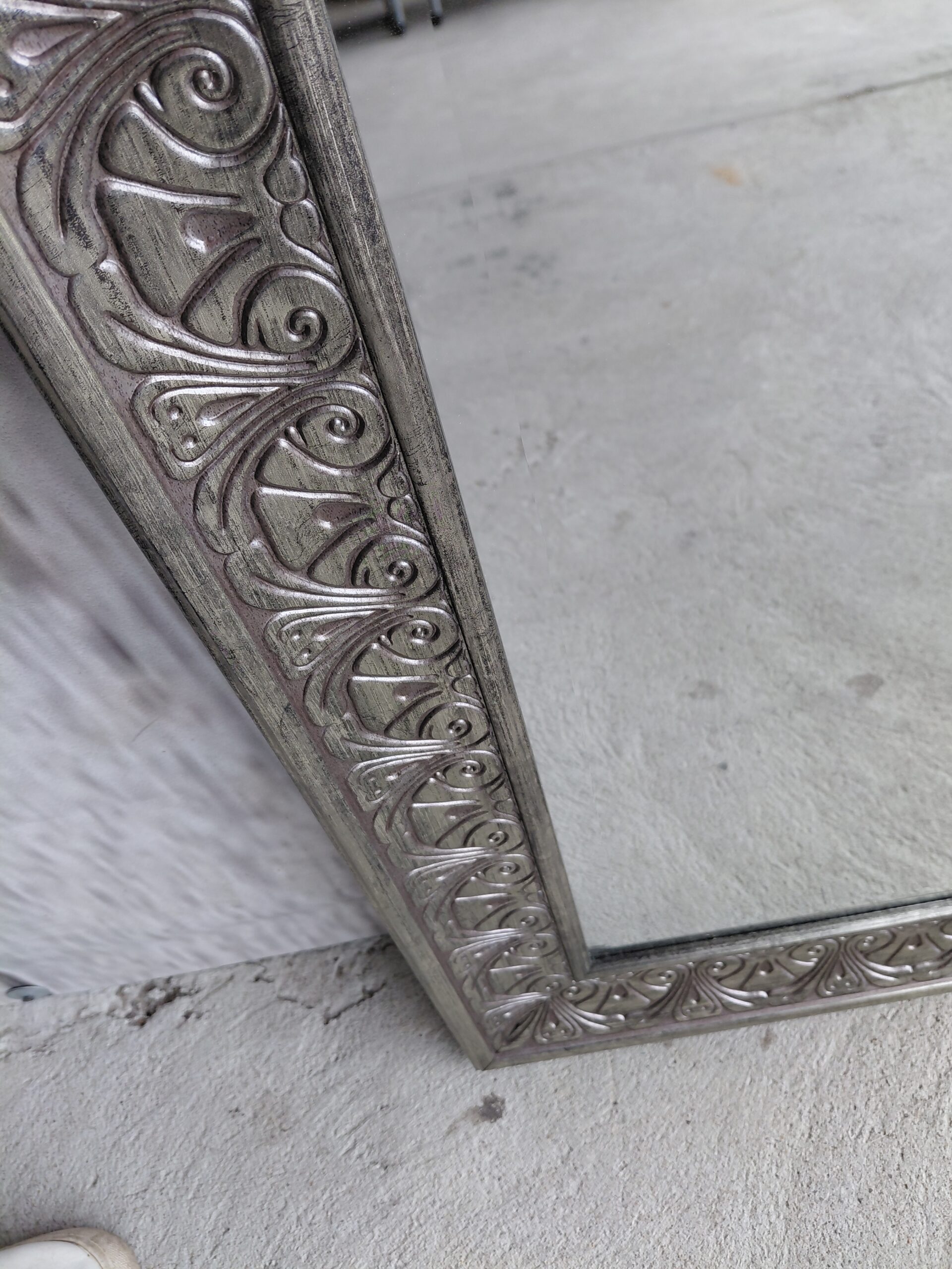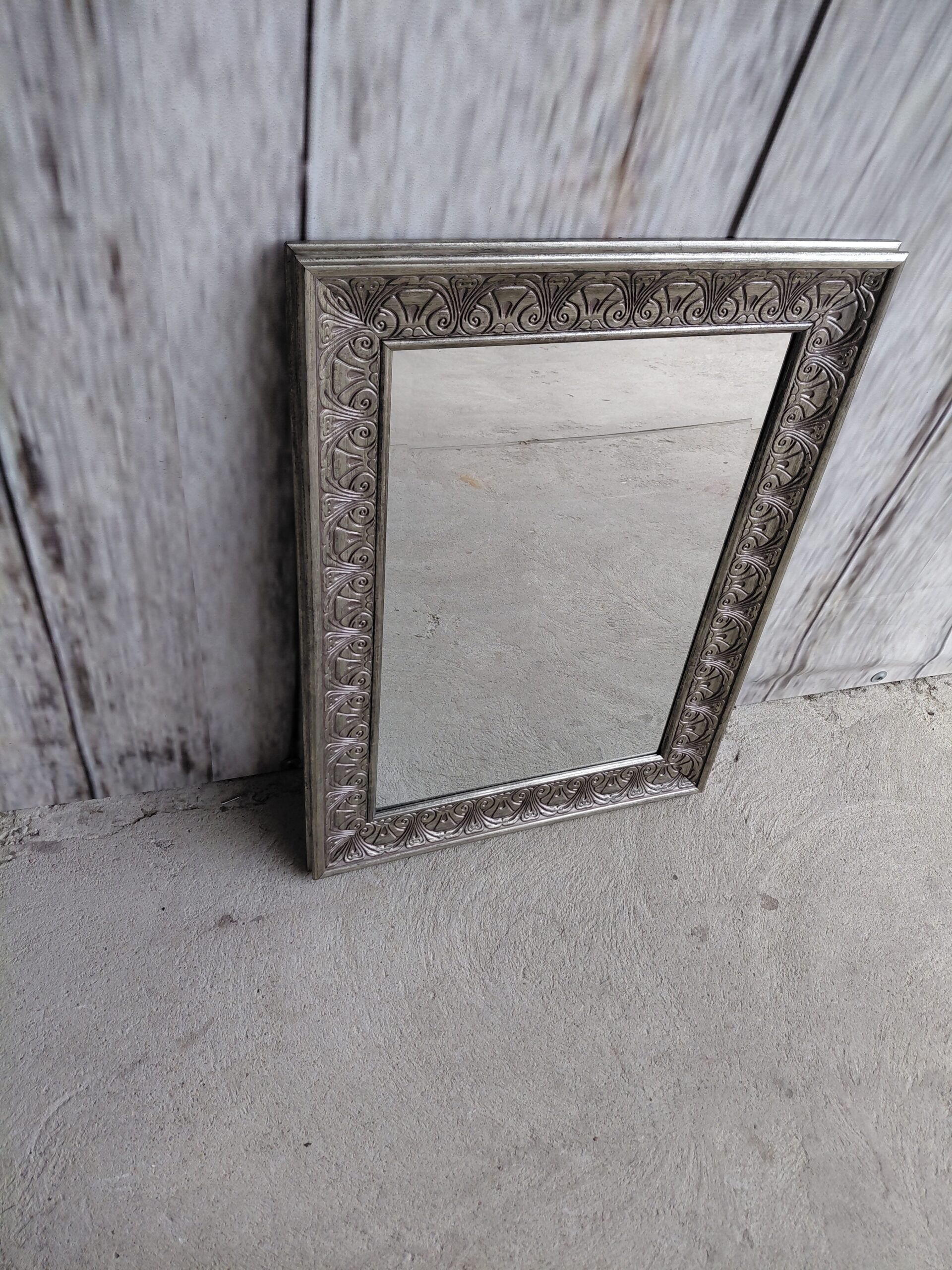 Stylowy, ozdobny lustro w srebrnej ramie z ładnymi, wytłaczanymi wzorami. Może być świetnym dodatkiem do każdego wnętrza. Produkt używany, ale w dobrym stanie.